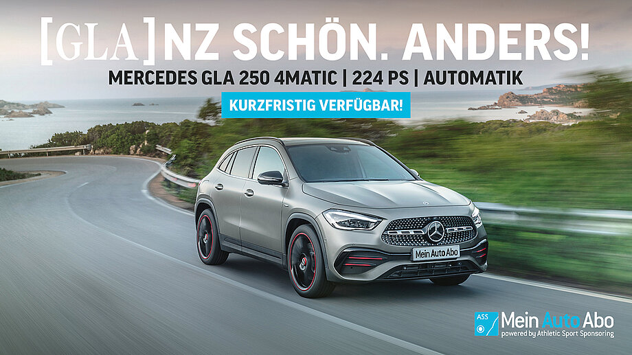 Der Mercedes GLA 250 im Neuwagen-Abo unseres Partners ASS Athletic Sport Sponsoring, steht Dir bei Deinen alltäglichen Abenteuern zur Seite. Für mtl. nur 449 € ist schon alles drin. Du musst nur noch tanken. Werde jetzt GLA-Fahrer und überzeuge Dich vom perfekten Rundum-Service.