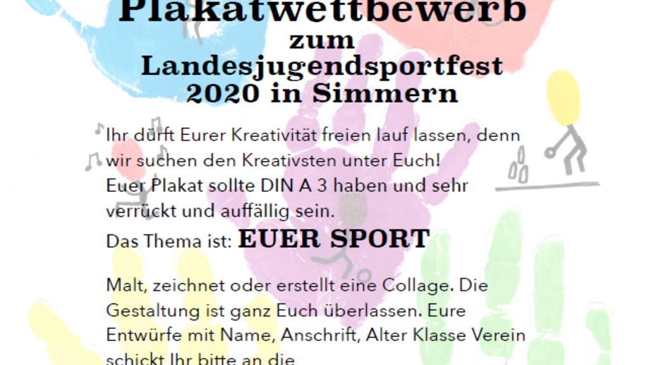 Damit jeder sehen kann, was beim Landesjugendsportfest geboten wird, hat die Sportjugend Rheinland einen Plakatwettbewerb für Kinder und Jugendliche ausgeschrieben. Bis zum 22. Mai können große und kleine Künstler ihre Entwürfe einreichen. Die besten Entwürfe werden prämiert und ausgestellt.